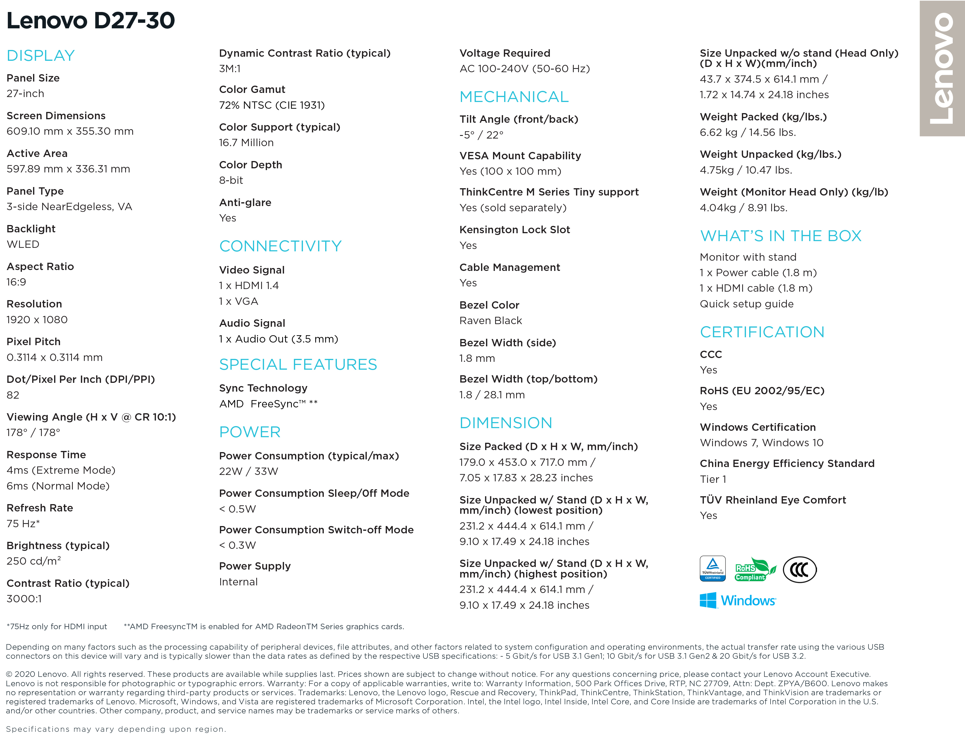 [BEST SELLER] Lenovo D27-30 27 Inch FHD 1920x1080 Monitor (66B8KAC6MY) 250nits | 72% NTSC 82 dpi | 4ms Response Rate | HDMI VGA Multiple Input | HDMI Cable Incl | 3Y Warranty