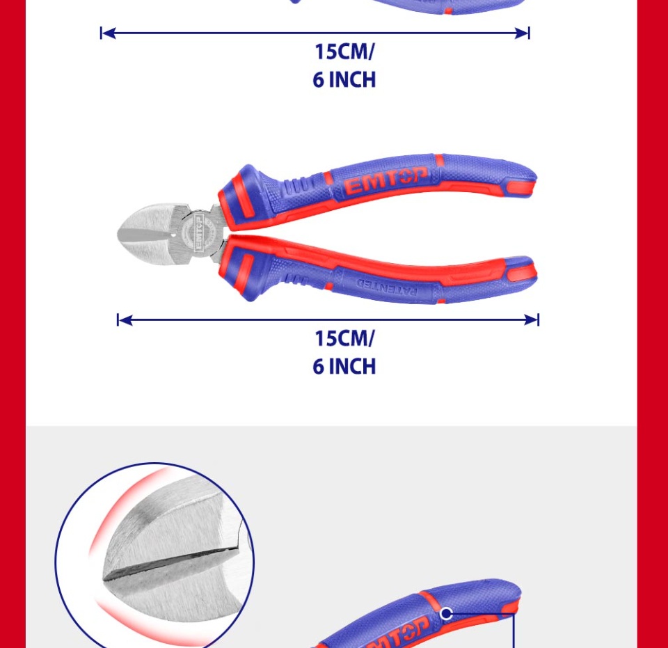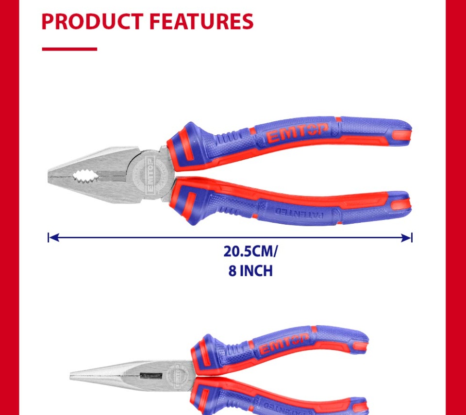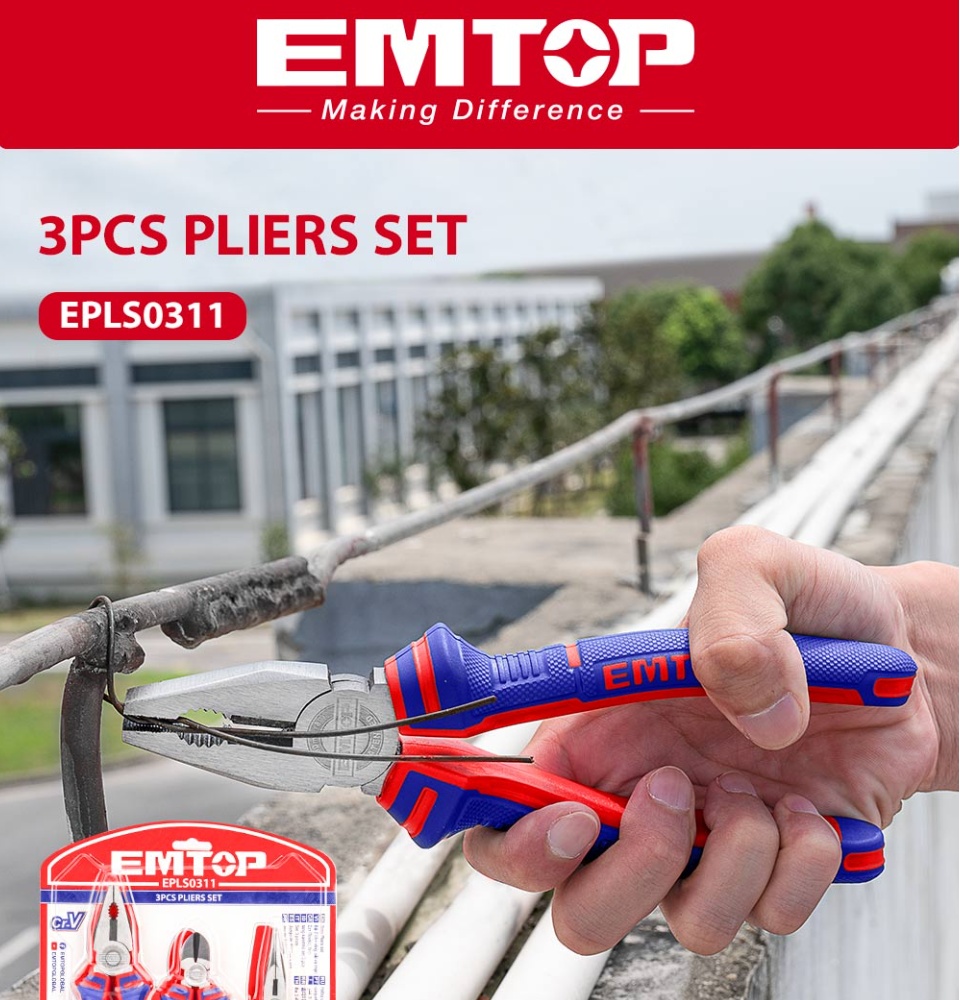 Bộ kìm EMTOP 3PCS, kìm kết hợp 8 inch, kìm mũi dài 6 inch, kìm cắt chéo 6 inch, kìm dây đa chức năng EPLS0311