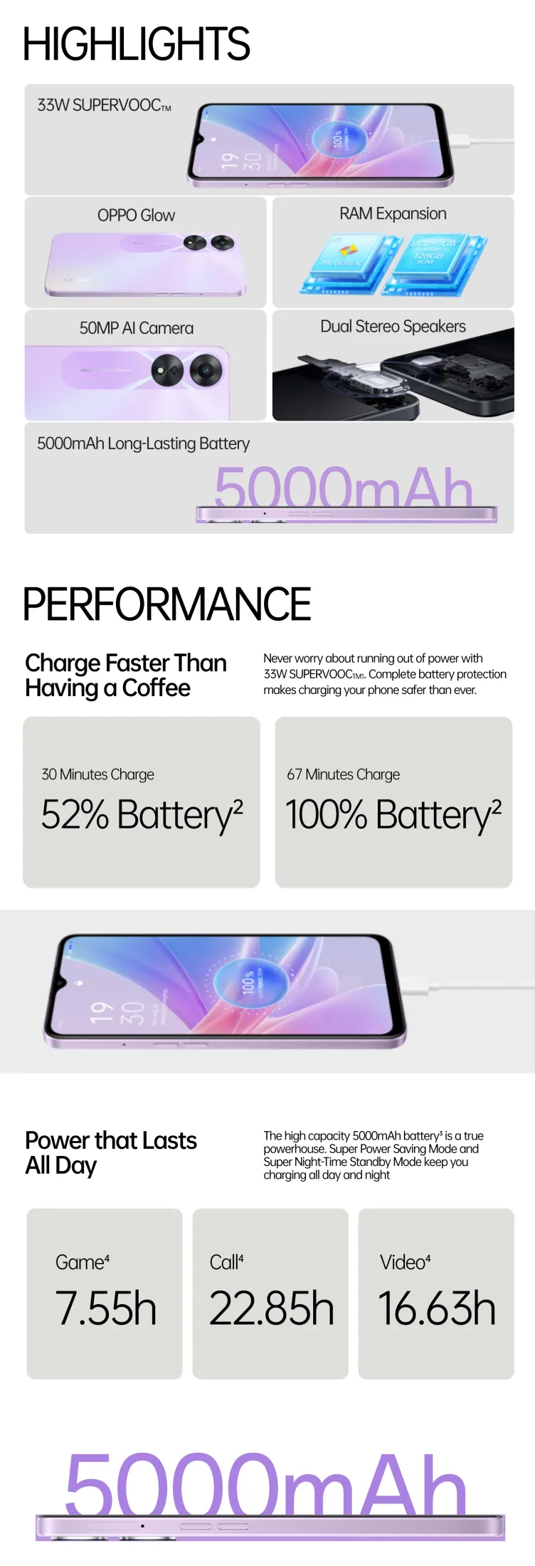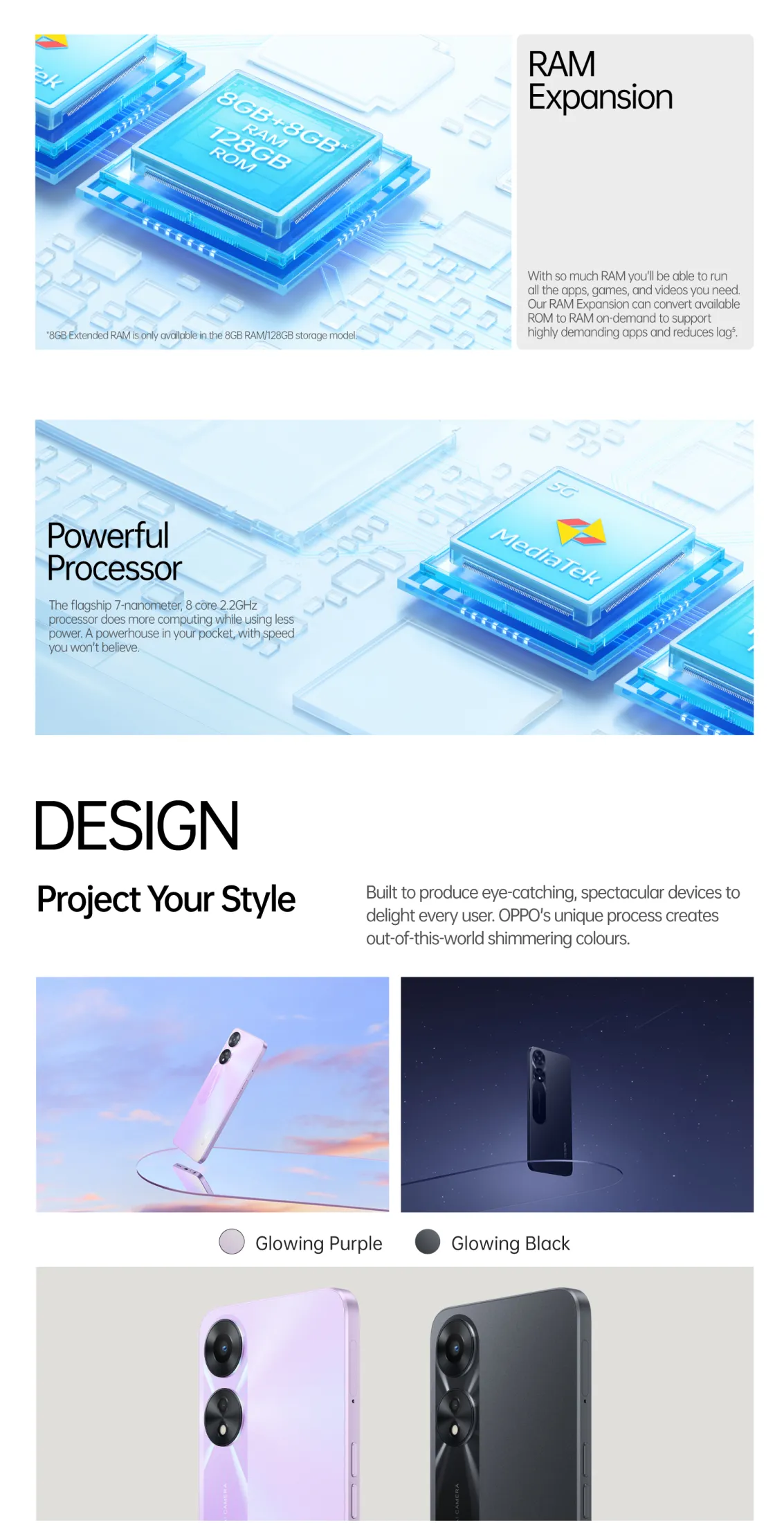 Featuring 33W SUPERVOOCTM and a 5,000mAh large battery, the OPPO A78 5G delivers improvements in battery and charging to guarantee a reliable and long-lasting experience. Through enhancements in both hardware and software, the A78 5G brings an all-round smooth performance alongside upgraded camera and entertainment features. Housed in a trendy design featuring the iconic OPPO Glow, the A78 5G also comes equipped with the ColorOS 13, providing convenient and efficient features in a fashion-forward device.