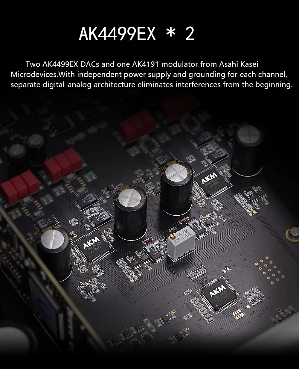 > The GUSTARD A26 DAC combines two AK4499EX DAC chips with one AK4191 modulator from Asahi Kasei Microdevices. With independent power supply and grounding for each channel, separate digital-analog architecture eliminates interferences from the beginning.